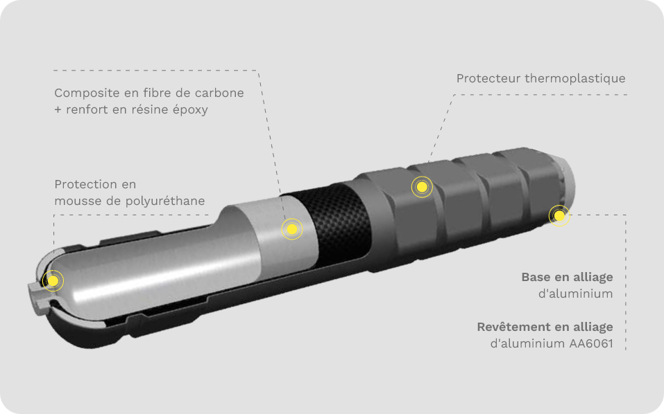 Cette bouteille légère et intelligente est disponible en trois formats de 200 bars (13, 20 et 50 litres) et trois formats de 300 bars (12, 18 et 45 litres).